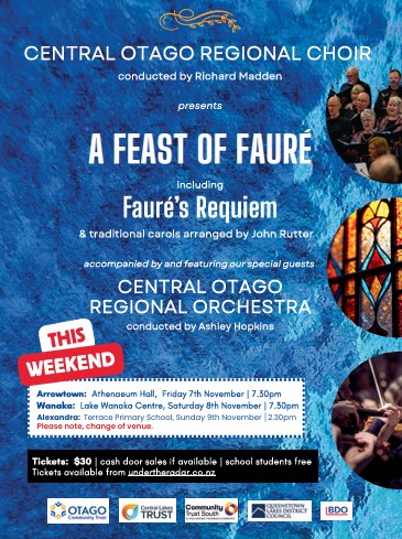 Join the Central Otago Regional Choir and the Central Otago Regional Orchestra for A Feast of Fauré – a concert celebrating the beauty and depth of Gabriel Fauré’s music, enriched by the warmth of traditional Christmas carols.