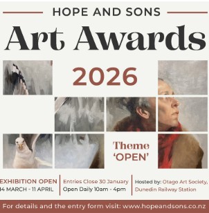 Call for Entries to the Hope and Sons Art Awards 2026, in conjunction with the Otago Art Society, located in the iconic Dunedin Railway Station.